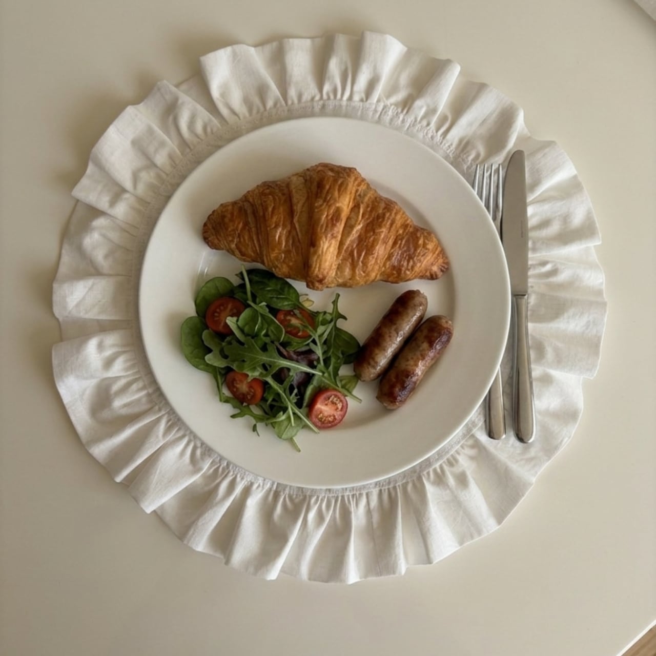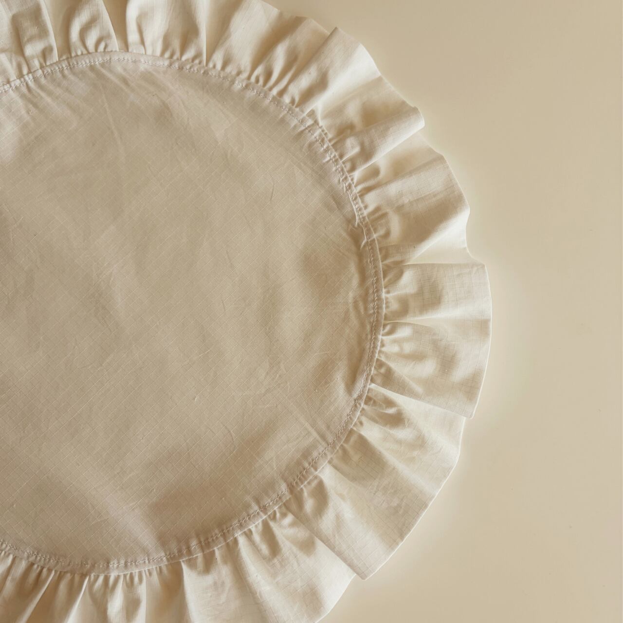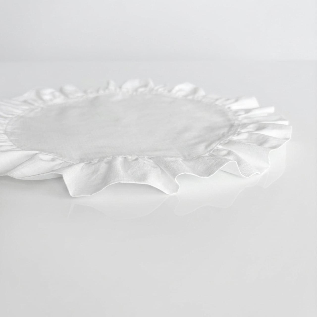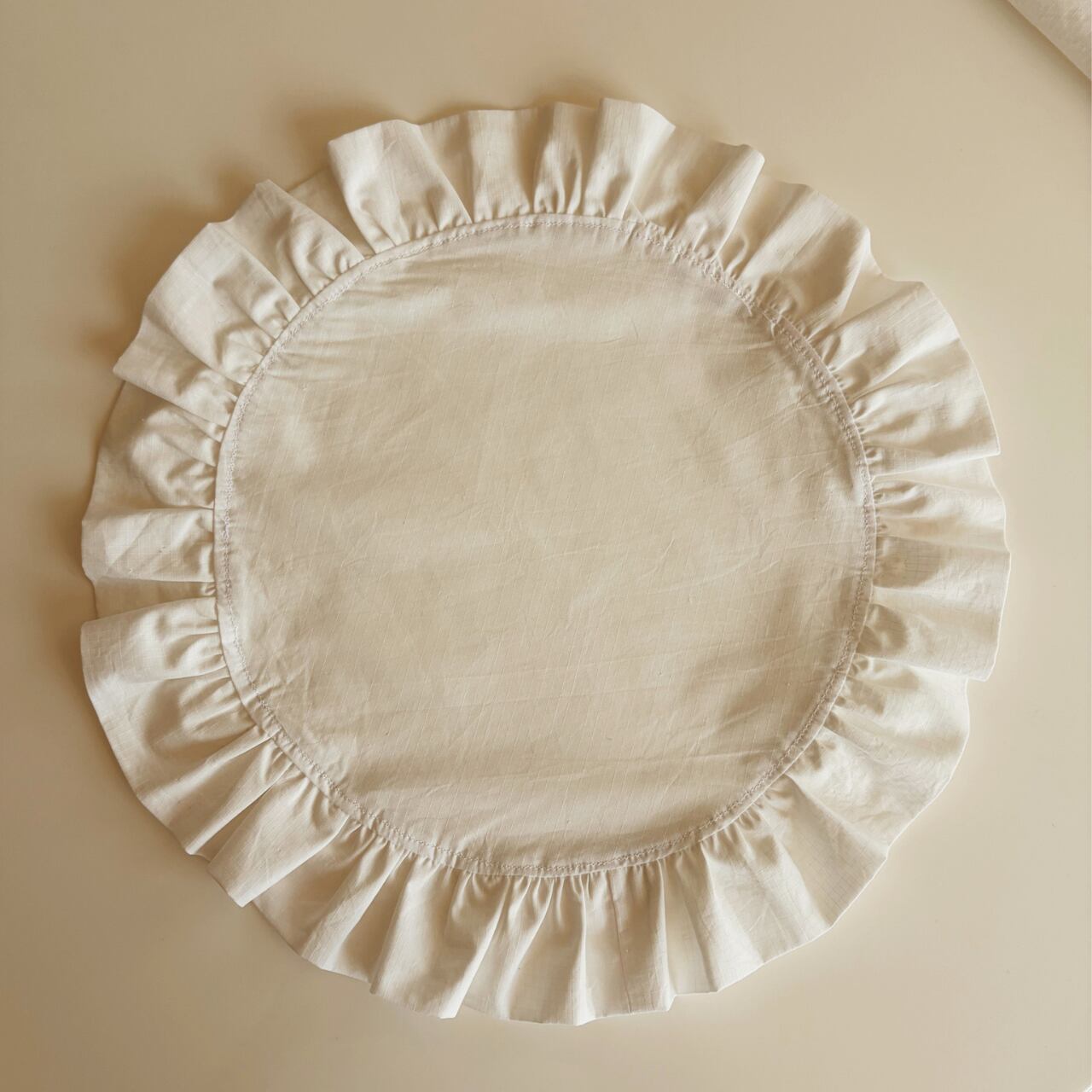 清潔感あふれる真っ白な薄手のコットン生地で、たっぷりのフリルをあしらったプレースマットを作りました。